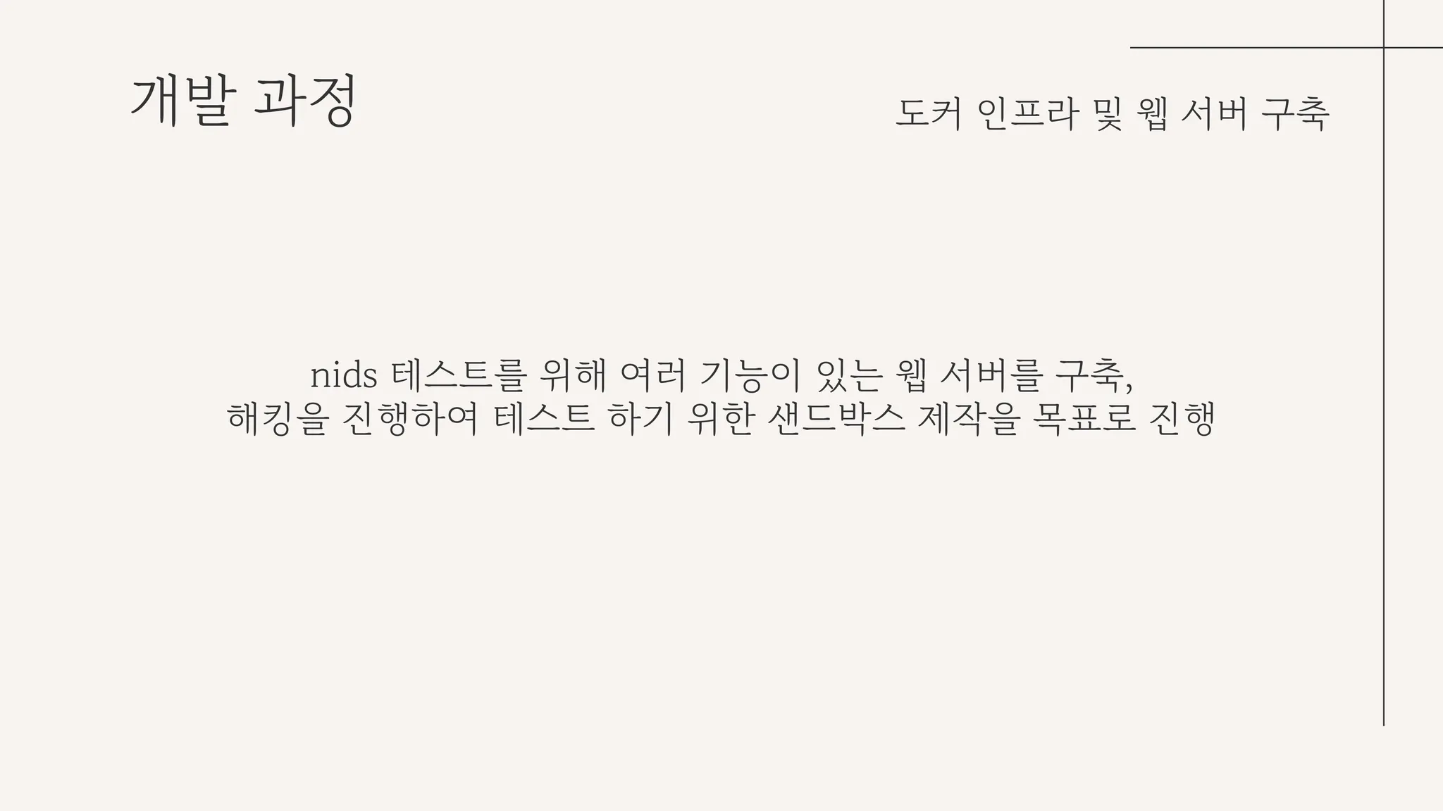 각 NIDS를 테스트하기 위해 여러 기능이 있는 웹 서버를 구축, 해당 웹 서버를 해킹하는 악성 행위를 시도하여 NIDS가 제대로 작동하는지 검증하는 샌드박스로 활용했다.