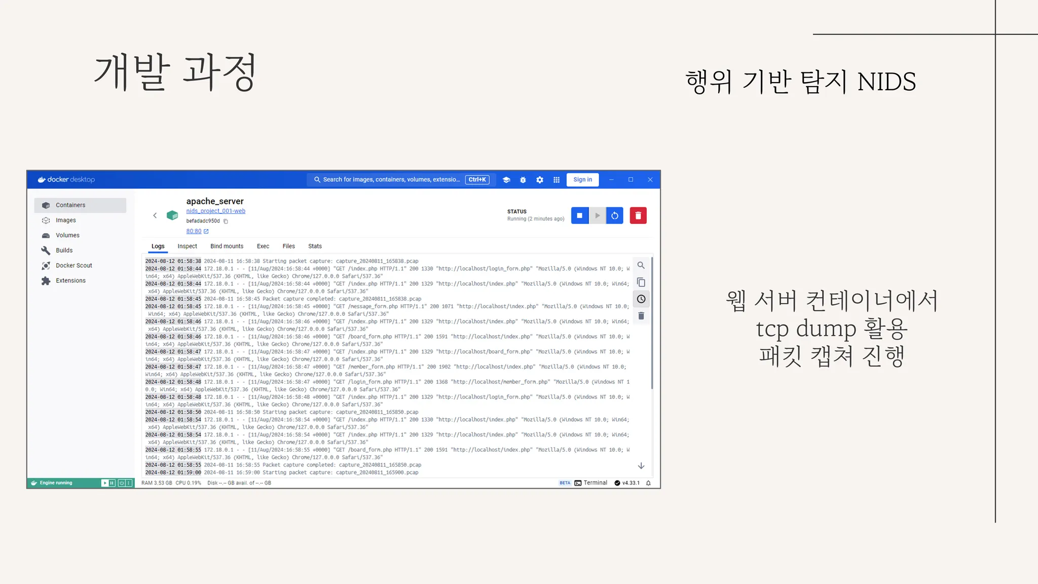 위 슬라이드는 웹 서버 컨테이너에서 tcp dump를 활용해 웹 서버로 드나드는 패킷을 캡쳐하는 모습이다.