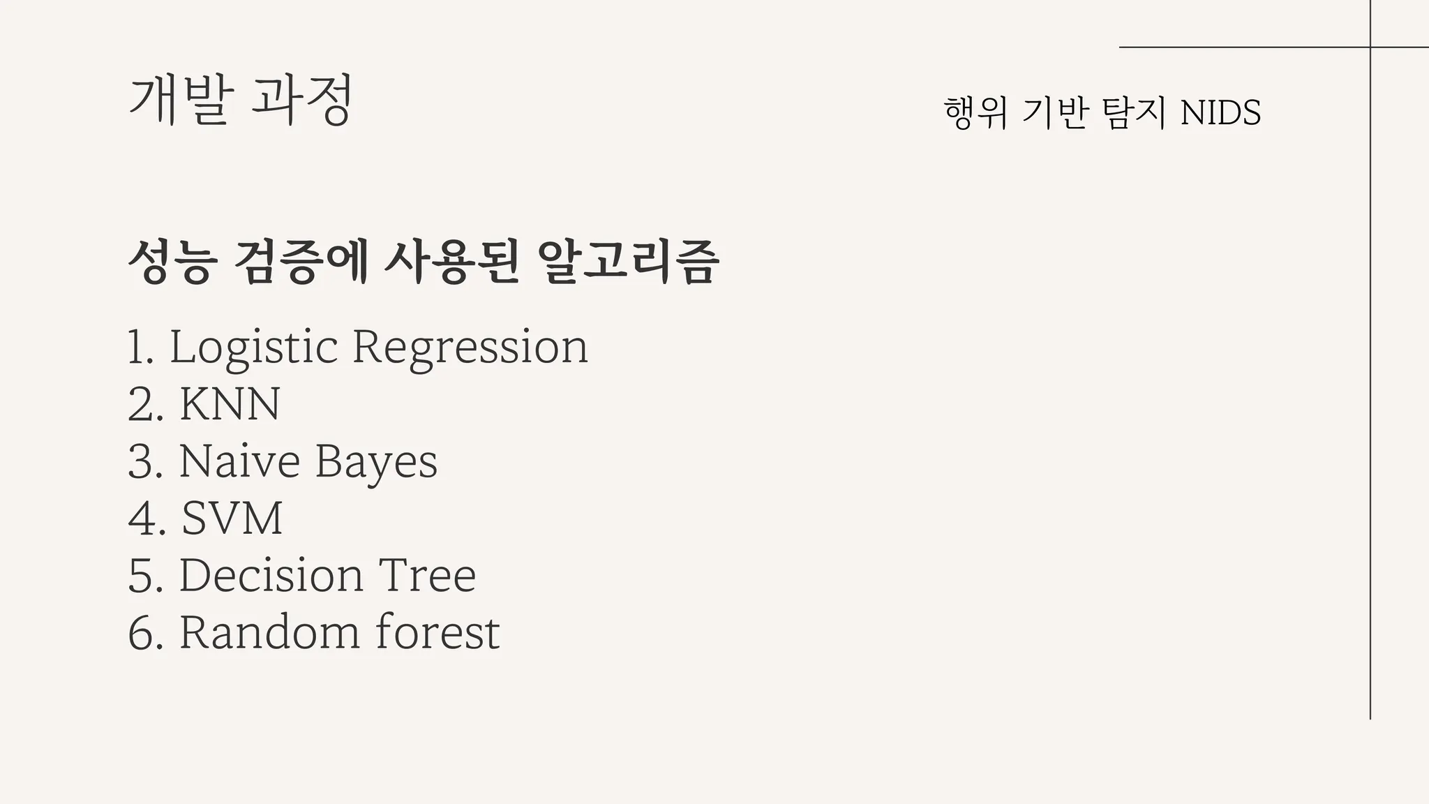 분류 문제에 사용되는 대표적인 6개의 알고리즘을 선정하여 NSL-KDD 데이터셋을 학습시켰다. 각 알고리즘의 특징은 아래와 같다.