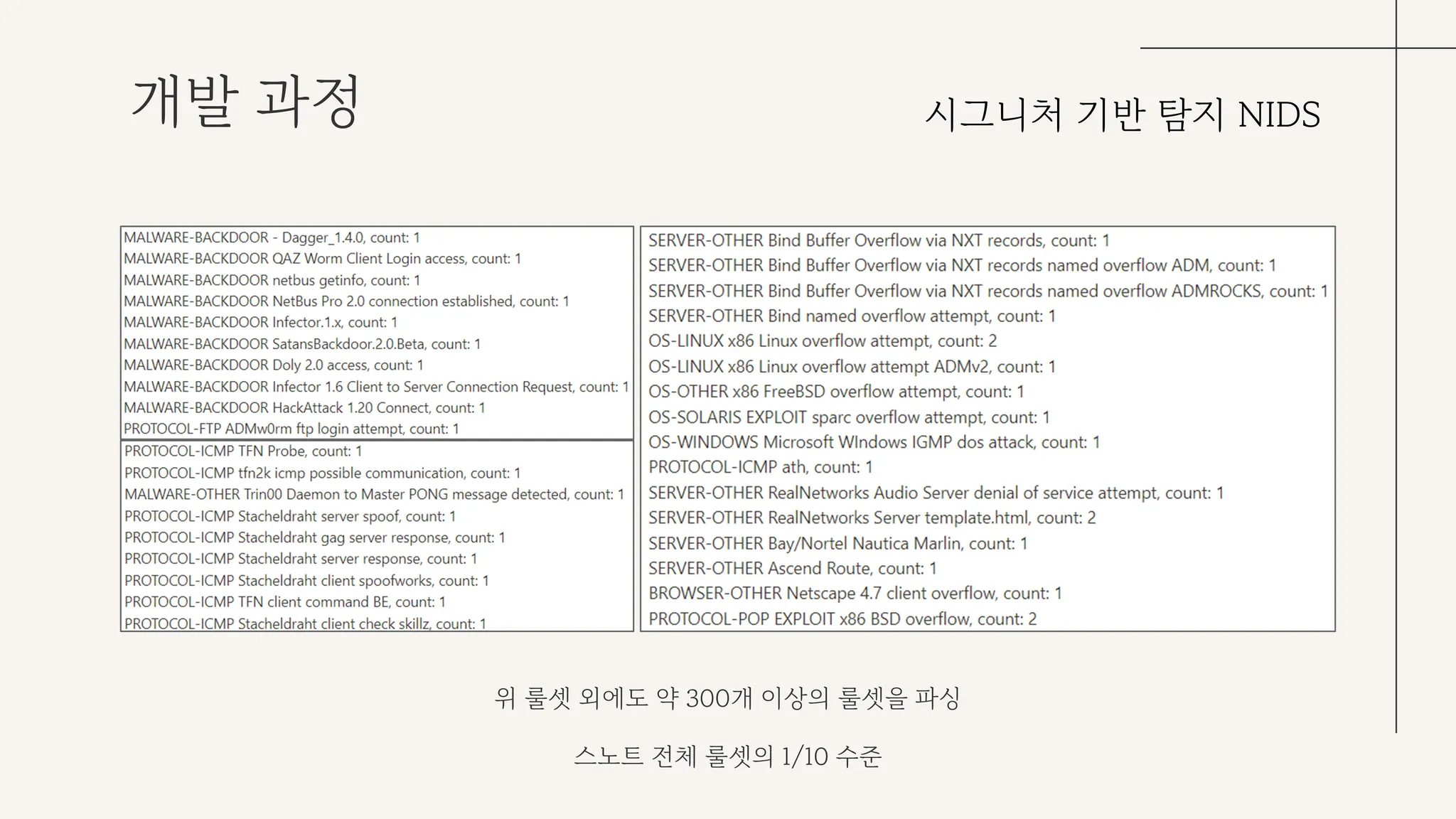 슬라이드에 나타낸 룰셋 이외에도 약 300개 이상의 스노트 룰셋을 파싱했는데, 스노트 전체 룰셋의 10% 수준 밖에 되지 않아 성능 개선이 필요하다고 판단했다. 이는 추후 진행 예정이다.
